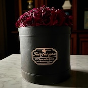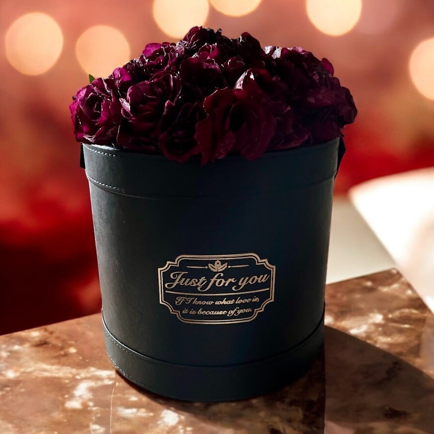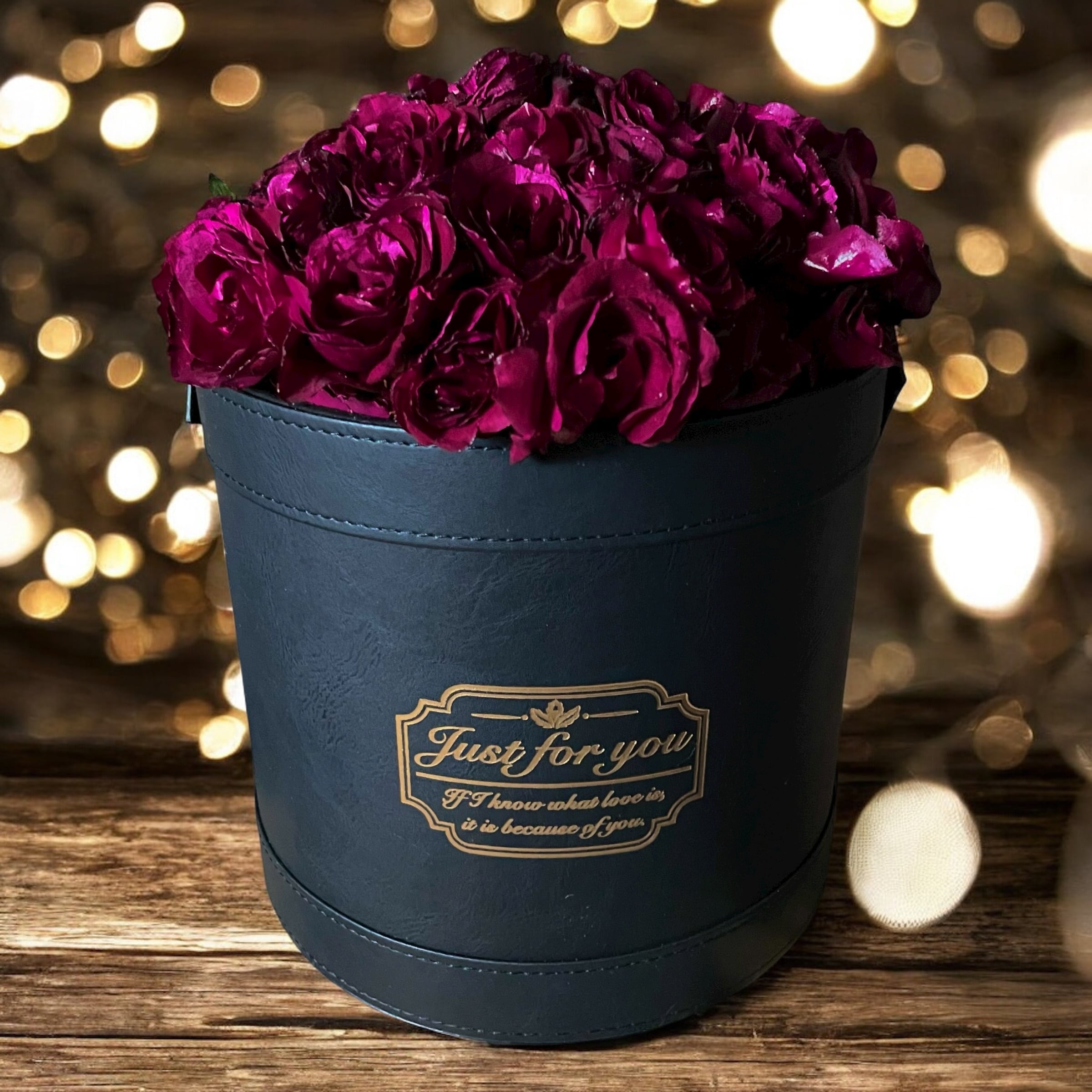 約50本のローズ+レザー調ボックスで、他にはないラグジュアリーな仕上がり。