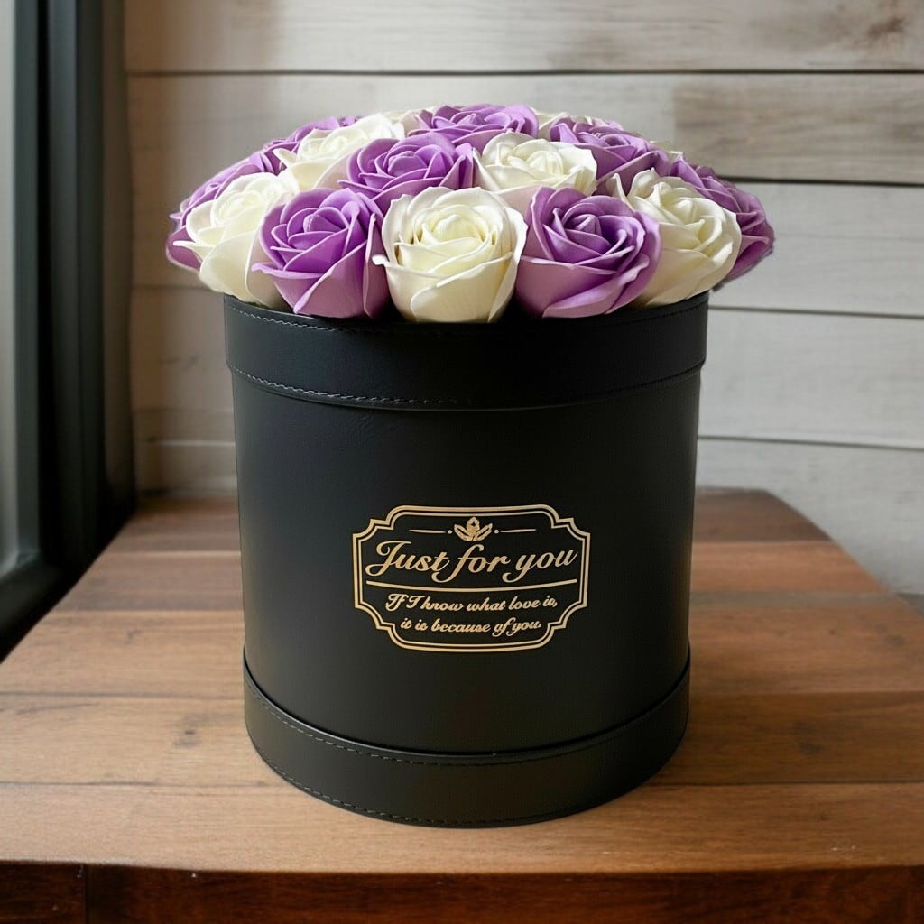 本革のような質感の高級レザーボックスに、サヴォンローズを収めました。