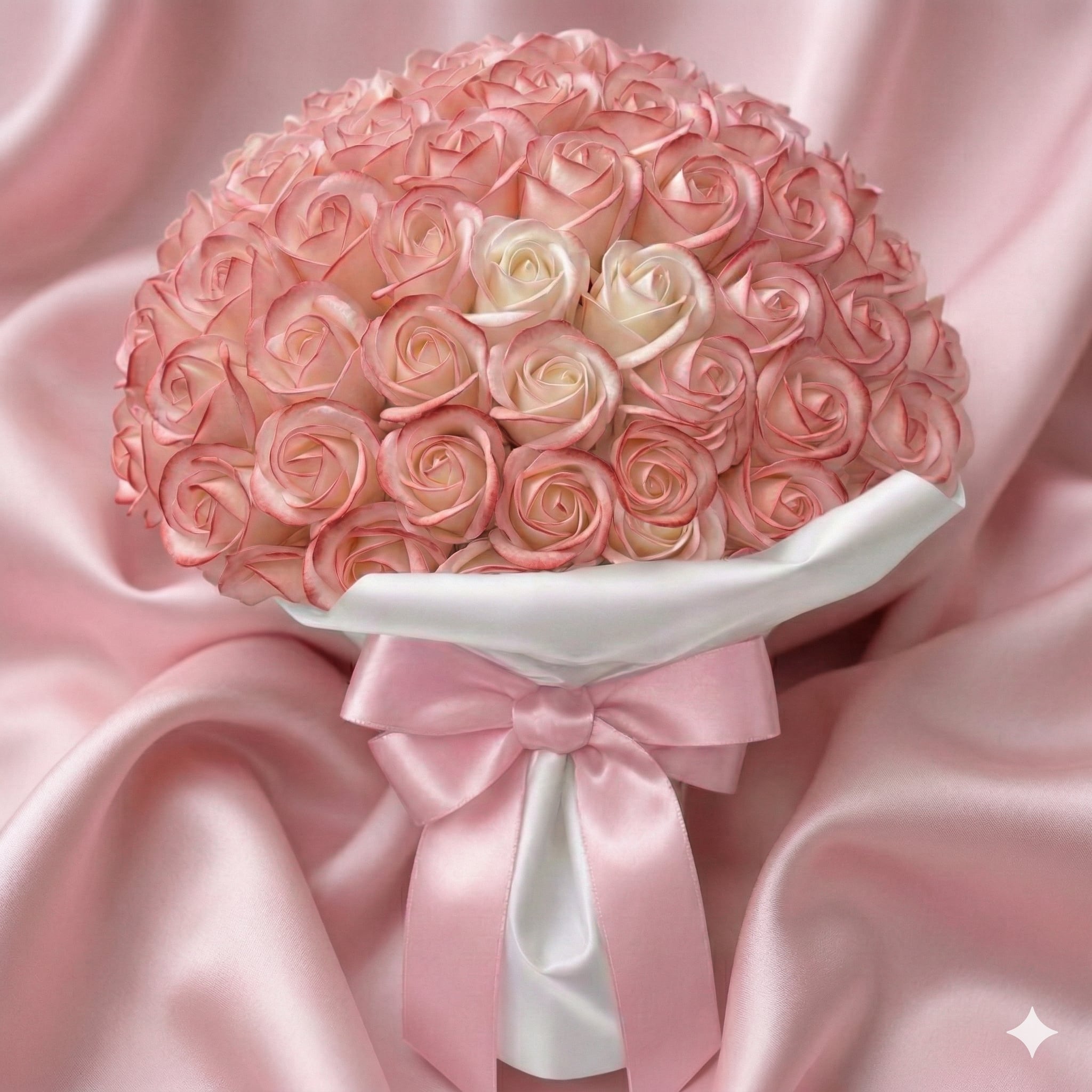 100本の薔薇が重なり合うことで生まれるパールのような微光沢と、柔らかなグラデーションは、見る人を一瞬で虜にする華やかさ。